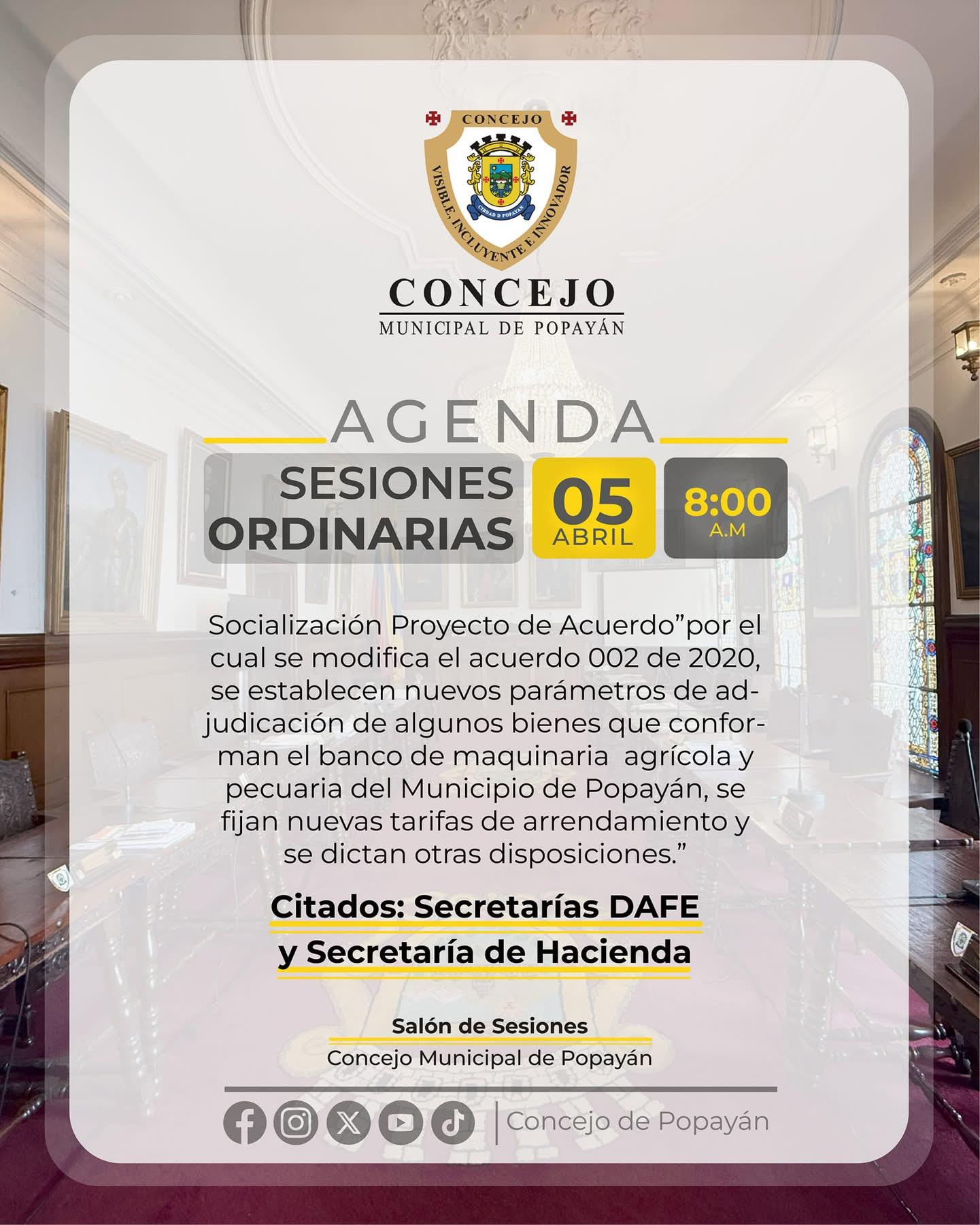Socialización Proyecto de Acuerdo" por el cual se modifica el acuerdo 002 de 2020, se establecen nuevos parámetros de adjudicación de algunos bienes que conforman el banco de maquinaria agrícola y pecuaria del Municipio de Popayán, se fijan nuevas tarifas de arrendamiento y se dictan otras disposiciones."