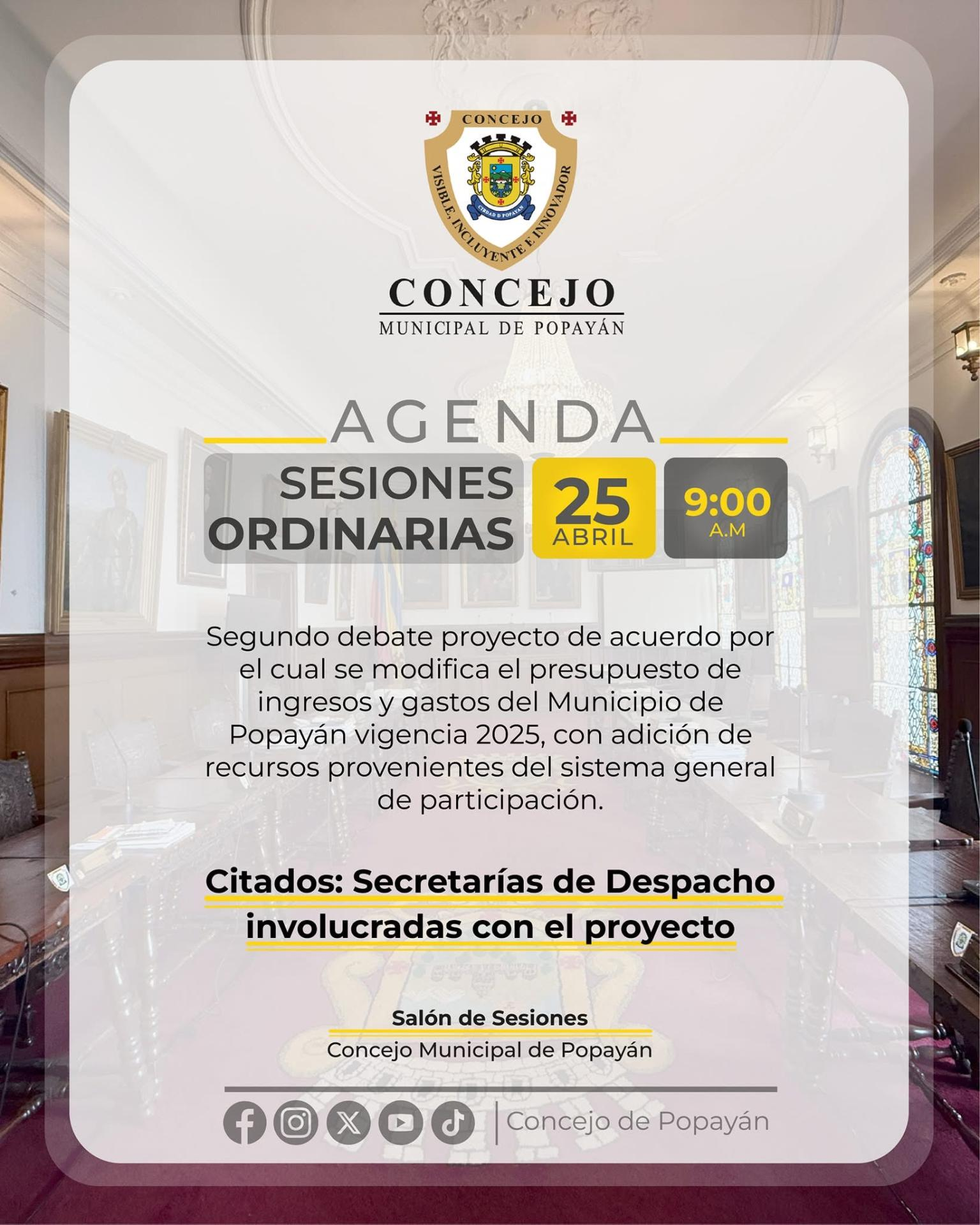 Segundo debate proyecto de acuerdo por el cual se modifica el presupuesto de ingresos y gastos del Municipio de Popayán vigencia 2025, con adición de recursos provenientes del sistema general de participación.