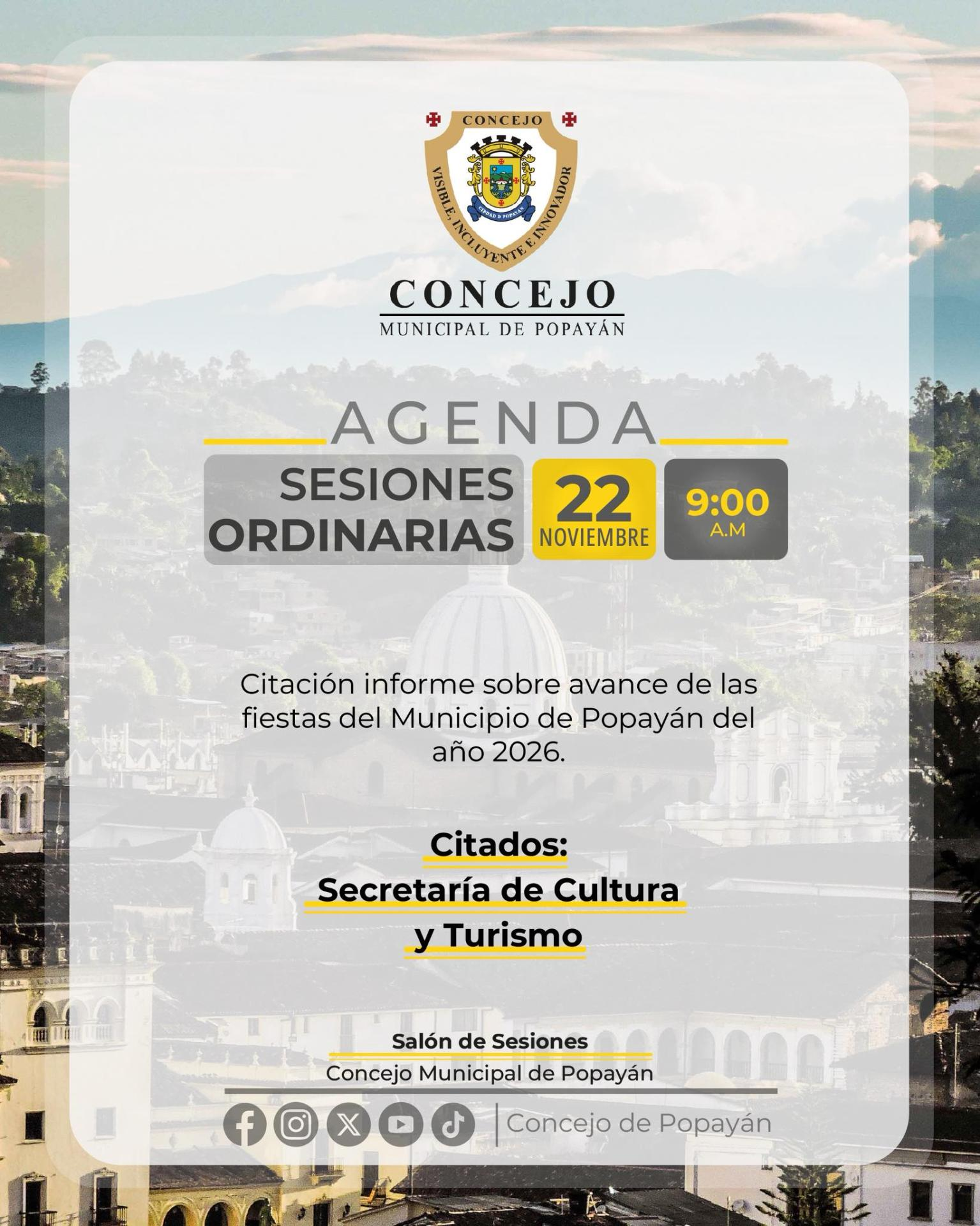 Este sábado 22 de noviembre, a las 9:00 a.m., el Concejo Municipal de Popayán recibirá a la Secretaría de Cultura y Turismo para la socialización del informe sobre el avance de la organización de las Fiestas del Municipio de Popayán 2026.