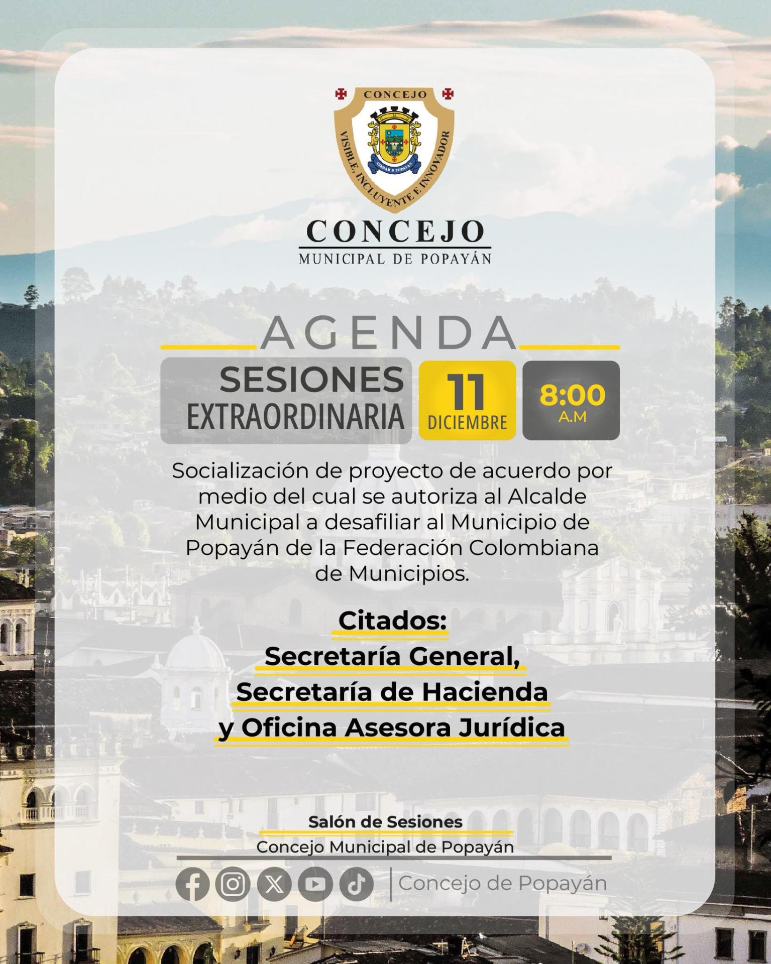 Este 11 de diciembre se realizará la socialización del proyecto de acuerdo que propone autorizar la desafiliación del Municipio de Popayán de la Federación Colombiana de Municipios. ![]()