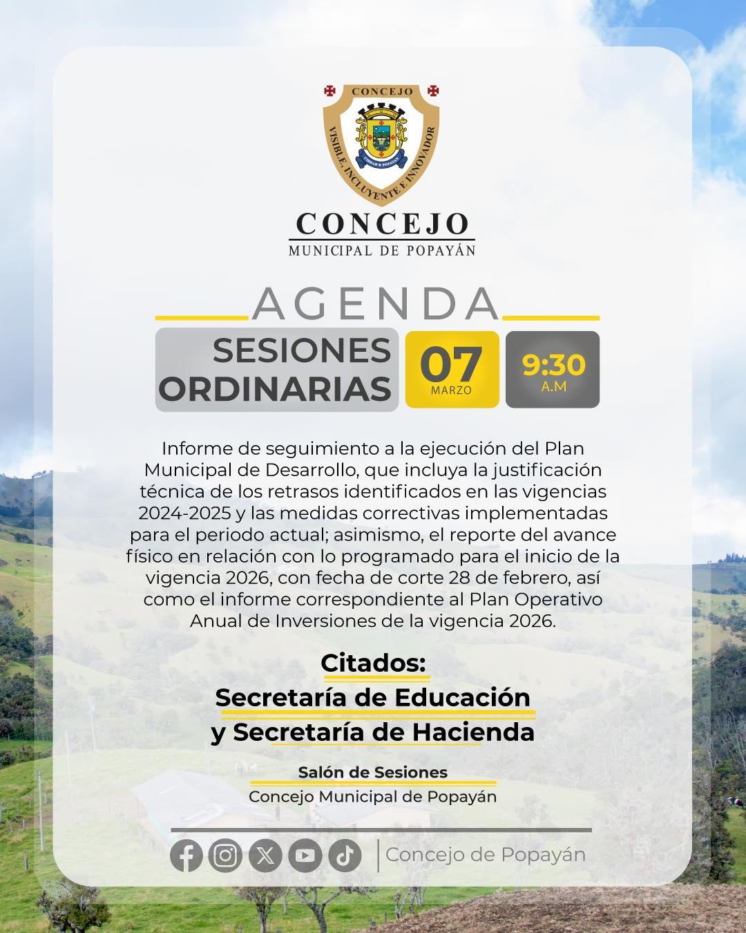 En esta sesión ordinaria se realizará un espacio de revisión y análisis con la Secretaría de Educación y la Secretaría de Hacienda, para conocer avances, gestión de recursos y acciones frente a los compromisos establecidos para el 2026.
