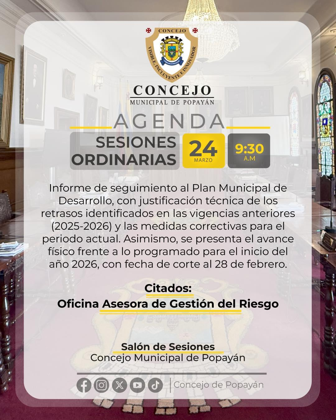 El Concejo Municipal de Popayán realizará seguimiento al Plan Municipal de Desarrollo, evaluando avances, retrasos y acciones correctivas para el cumplimiento de las metas.