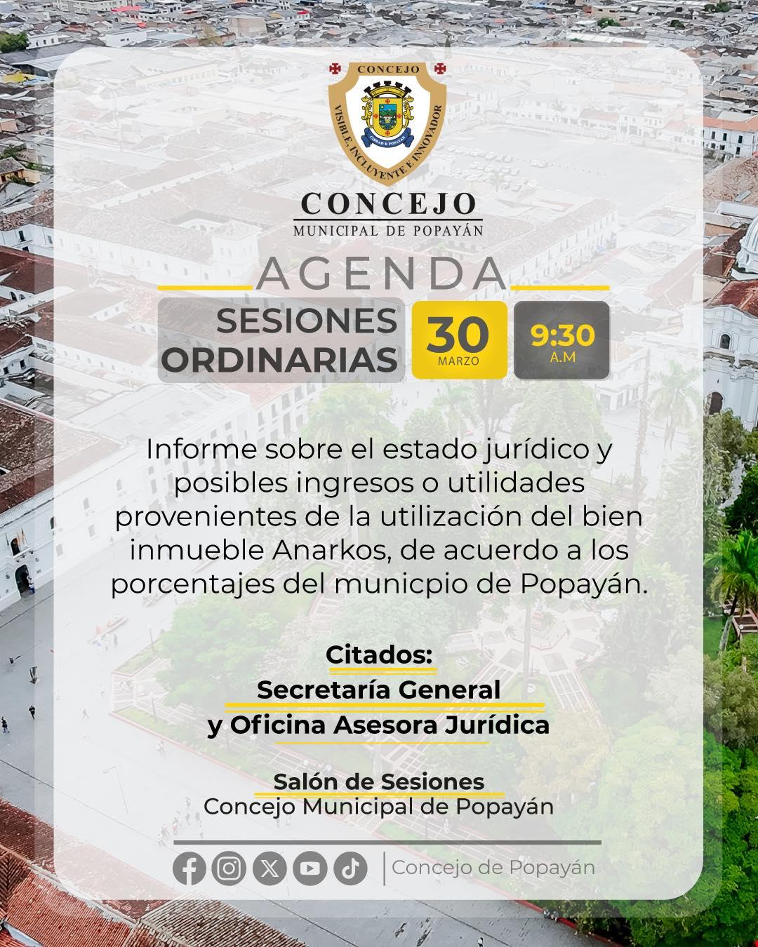 En sesión ordinaria, el Concejo Municipal de Popayán abordará el análisis sobre el estado jurídico y las posibles utilidades del bien inmueble Anarkos, un tema clave para el interés de la ciudad.
